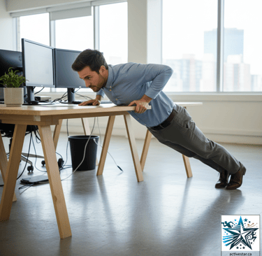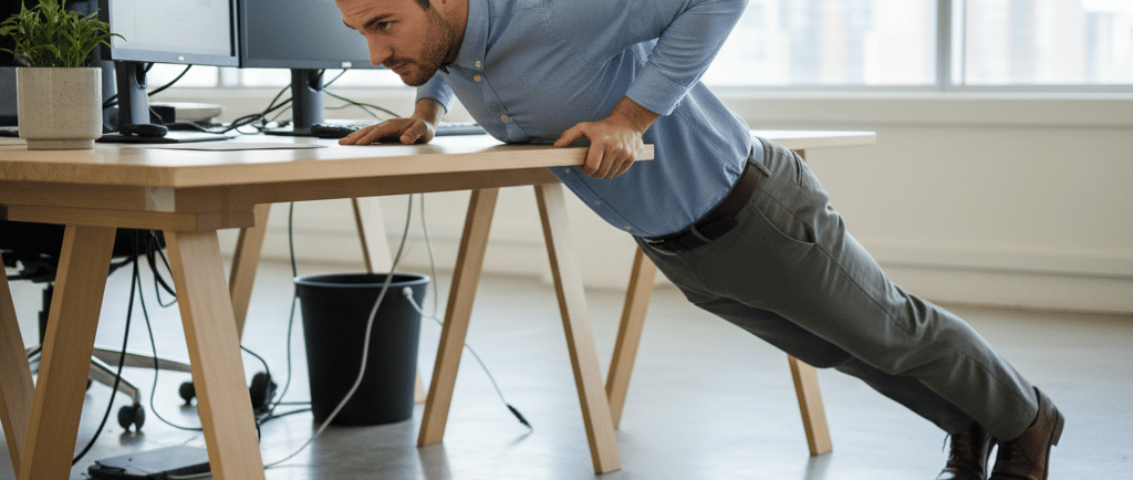 Primary Move: Desk Push-Ups. Stand facing your desk, feet hip-width apart. Place your hands on the edge of the desk, slightly wider than your shoulders. Keeping your body in a straight line from head to heels, lower your chest towards the desk, then push back up.